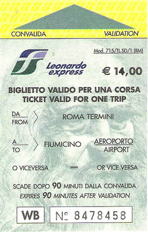 Билет можно приобрести в кассе на ж-д. вокзале как в аэропорту, так и на Термини, в автоматах продажи билетов, в местных турагенствах и непосредственно перед посадкой на поезд на пероне у официальных лиц. В этом случае билет будет стоить 15 евро.